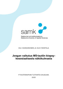 (2025)Opinnäytetyön tavoitteena oli selvittää, onko viiden viikon säännöllisellä joogaharjoittelulla vaikutusta MS-taudin oireisiin biopsykososiaalisesta näkökulmasta, ja millaisia nämä vaikutukset ovat. Opinnäytetyön tarkoituksena ... -