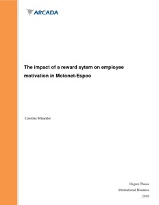 The purpose of the thesis was to investigate and analyze how well the current reward sys-tem of Motonet-Espoo helps generate employee work motivation. More specifically it aimed to find out which aspects of the reward system functions well, and which aspects could be further developed and improved in order to increase employee satisfaction. The theoretical part of the study introduces different theories of motivation and rewarding. Emphasis is put on Maslow's hierarchy of needs, the goal setting theory and the total re-ward system. The empirical part of the thesis was conducted by using a quantitative re-search method. The data was gathered with the help of a questionnaire and two inter-views. The aim of the research was to compare the different reward systems used in Mo-tonet-Espoo and find the pros and cons of them. The research results revealed how Moto-net-Espoo can develop their reward system by including the employees in the decision making process. The research supports the assumption that a well developed and func-tional reward system can increase employee motivation and satisfaction.