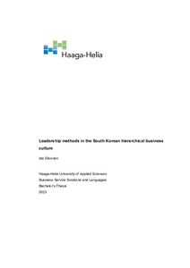 This research-based thesis aims to determine the leadership methods and styles presented and practiced in the Korean hierarchical business culture. It works as a guide for people who wish to enter the South Korean corporate market. This research uses books, articles, websites, interviews, and surveys to determine and identify the cultural aspects and leadership methods executed in South Korea. The research question “What leadership methods are executed in South Korean corporate environment” will be answered by conducting a quantitative survey and qualitative interviews concluding with comparing results found in the theoretical research.