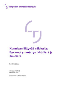 (2025)Opinnäytetyön tavoite oli auttaa ymmärtämään paremmin kunniaan liittyvää väkivaltaa, erityisesti sitä tekevien ihmisten ja sen taustalla olevien kulttuuristen tekijöiden näkökulmasta. Tarkoituksena oli tutkia, miten tekijät ... -