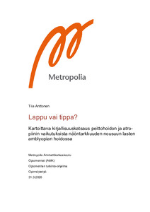 Lappu vai tippa? : kartoittava kirjallisuuskatsaus peittohoidon ja atropiinin vaikutuksista näöntarkkuuden nousuun lasten amblyopian hoidossa