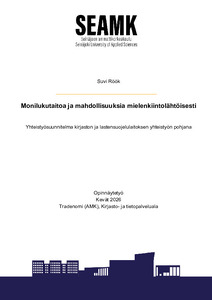 (2026)Kehittämistyönä toteutetun opinnäytetyön tavoitteena oli tuottaa Seinäjoen kaupunginkirjaston toimeksiannosta yhteistyösuunnitelma kirjastolle ja Törnävänpuiston lastensuojelulaitokselle. Toimeksiannon taustana oli ... -