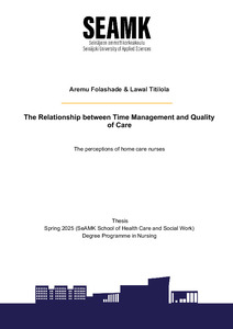 (2025)This thesis explores the relationship between time management and quality of care in home care from the perspective of home care nurses. Home care is medical care received or given to a patient by a physician or a team ... -