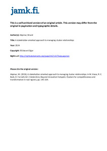 (Edward Elgar, 2024)Clusters are important for achieving regional competitiveness and development through innovations and new business development, but the realization of this goal requires good management of relationships. This bears challenges ... -