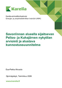 (2026)Tässä opinnäytetyössä arvioitiin Pellos- ja Kuhajärven ekologinen nykytila sekä laadittiin tutkimuksiin perustuva alustava kunnostussuunnitelma. Arviointi perustui vedenlaadun mittauksiin, sedimenttikairauksiin sekä ... -