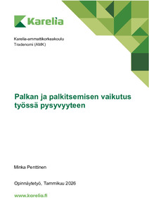 (2026)Tämän opinnäytetyön tarkoituksena oli tutkia, kuinka palkka ja palkitseminen vaikuttavat työssä pysyvyyteen. Lisäksi tavoitteena oli selvittää, millaiset palkitsemiskeinot motivoivat ja sitouttavat yrityksen henkilökuntaa ... -