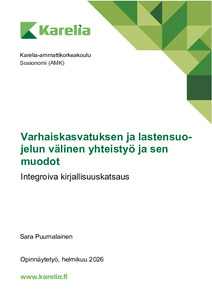 (2026)Opinnäytetyön tarkoituksena oli selvittää kirjallisuuskatsauksen keinoin jo olemassa olevia rakenteita ja malleja moniammatilliseen yhteistyöhön. Tässä opinnäytetyössä tutkittiin varhaiskasvatuksen ja lastensuojelun välistä ... -