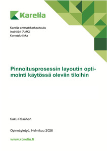 (2026)Tämän opinnäytetyön tarkoituksena on etsiä pinnoitusprosessiin ja sen nykyisiin tiloihin vaihtoehtoisia layout-ratkaisuja. Tällä tavoitellaan tuotantotilan kokonaisvaltaista hyödyntämistä, materiaalin virtojen selkeytymistä, ... -