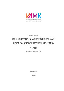 (2025)Opinnäytetyön tarkoituksena oli luoda selkeä ohje Wärtsilä Finland Oy 25-moottorin asennustyöhön, sekä selvittää keinoja, joilla asennustyötä voitaisiin tehostaa. Opinnäytetyö aloitettiin asennustyön vaiheiden selventämisellä, ... -
