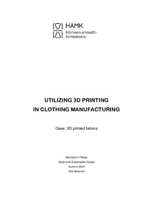 (2024)The aim of the thesis was to examine the possibilities of 3D printing in the clothing manufacturing. The work delved into different printing methods used in clothing and it is also clarifying the materials used in 3D ...