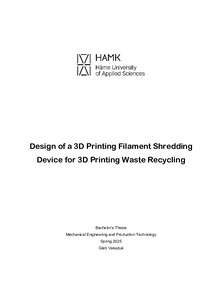 (2025)The thesis was focused on developing a design of a 3D printing plastic shredder for HAMK Design Factory. The shredder was aimed to address the problem with 3D printing plastic waste management and reuse. The need in design ... -