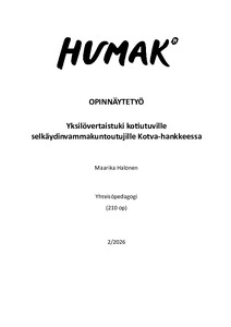(2026)Opinnäytetyön tarkoituksena oli lisätä ymmärrystä vastavammautuneiden selkäydinvammaisten kokemuksista, toiveista ja tarpeista vertaistuen suhteen sekä tuottaa hankkeelle tietoa vertaistukiprosessin kehittämiseksi. ... -