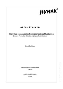 (2026)Tämän opinnäytetyön tavoitteena oli kehittää Kosmos Festivalille toimintaohje jätteiden lajittelun toteuttamiseen festivaaliympäristössä sekä tunnistaa viestinnällisiä keinoja, jotka tukevat oikeaoppista lajittelua. Kosmos ... -