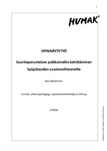 (2026)Tämän opinnäytetyön tavoitteena oli selvittää, soveltuuko HUS Runkopalveluissa käytössä oleva suoritepalkkamalli sellaisenaan tai sovellettuna käytettäväksi Syöpätautien palvelualueen osastonsihteerien ajanvaraustyössä. ... -