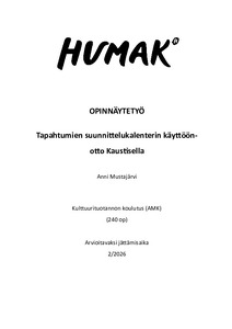 (2026)Opinnäytetyön tavoitteena oli selvittää tapahtumien suunnittelukalenterin käyttöönottoa Kaustisella. Työn tilaajana on kaustislainen kulttuuri- ja tapahtuma-alan yritys LoveKaustinen. Tapahtumien suunnittelukalenteri oltiin ... -