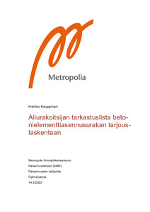 (2025)Tämän opinnäytetyön aiheena oli betonielementtiasennusurakan tarjouksen laskenta aliurakoitsijan näkökulmasta. Työssä tarkasteltiin, mitä asioita urakoitsijan tulee huomioida tarjousvaiheessa, jotta urakka voidaan toteuttaa ... -