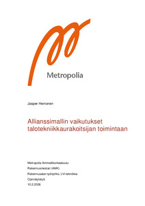 (2026)Tässä opinnäytetyössä tarkasteltiin allianssimallin vaikutuksia talotekniikkaurakoitsijan LVI-työnjohdon toimintaan toteutusvaiheessa Laakson yhteissairaala -allianssihankkeessa. Tavoitteena oli kuvata LVI-työnjohdon roolia, ... -