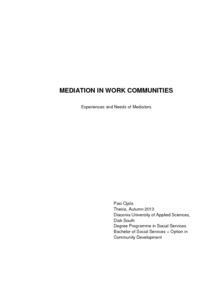 This Bachelor's thesis examines work community mediation from mediators' point of view. The study is implemented in cooperation with Timo Pehrman, who is the chairman of the Finnish Forum for Mediation and a trainer of work community mediation. A previous study by Pehrman from 2011, which concentrated to explore the current needs of the work community mediators, served as a background for this research. The idea of this study was to deepen the results of the Pehrman's research.