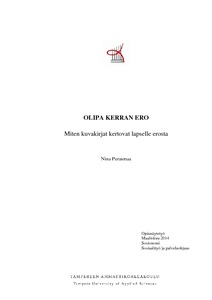 Tässä opinnäytetyössä selvitettiin, miten kuvakirjat kertovat lapsille vanhempien erosta, miten kuvakirjojen kerronta vastaa sitä, mitä teoriatiedon pohjalta tiedetään lapsen kokevan vanhempien erotessa, ja millainen on lasta tukeva ja auttava eroa käsittelevä kuvakirja. Sivuteemana tarkasteltiin, kenen näkökulma kirjoista välittyy ja onko kuvakirjojen kerronta muuttunut vuosikymmenten saatossa erojen yleistymisen myötä. Tutkimuksen tavoitteena oli tuottaa uutta tietoa kuvakirjatutkimuksen, perhe-käsitteen ja eroa tutkivien teorioiden pohjalta.