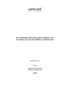 Opinnäytetyön aiheena oli ACF-bondausprosessin kehittäminen teknologian kehityksen laboratoriossa. Laboratorio valmistaa prototyyppi- ja teknologian kehitysosia käyttäen muottiin valetun rakenteellisen elektroniikan teknologiaa. Tavoitteena oli parantaa prosessia ja saavuttaa parempi ymmärrys sen kyvykkyydestä.