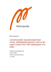 Työn toteutus koostui kirjallisuustutkimuksesta, sääntelydokumentaation analysoinnista sekä sähkölaitekorjaamon prosessien ja työmenetelmien tarkastelusta. Menetelmäosuudessa kuvataan korjaamotoiminnan keskeiset vaiheet, huoltodokumenttien rooli sekä akkujen ja sähköisten laitteiden tarkastus- ja testausprosessit Part-145:n vaatimusten mukaisesti. Tuloksia voidaan hyödyntää huoltotoiminnan kehittämisessä Part-145-organisaatioissa. Lisäksi työ tarjoaa perustan laajemmalle selvitykselle akkujen huoltokäytännöistä ja turvallisuusvaatimuksista osana taustakorjaamotoimintaa.