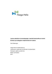 (2025)Opinnäytetyön päätavoitteena oli rakentaa vahva laatukulttuuri viestinnän sekä oppimisen keinoin ja näin olla tukemassa strategian implementoinnissa. Tavoitteeseen pääsemiseksi hankittiin ymmärrystä nykytilasta ja kartoitettiin ... -