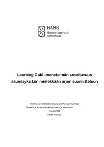 (2026)Tässä opinnäytetyössä tarkasteltiin Learning Café -menetelmän toimivuutta työpajatyöskentelyssä. Tutkimus kohdistui Pirkanmaan hyvinvointialueen yhden ympärivuorokautisen palveluasumisyksikön mielekkään arjen suunnitteluun. ... -