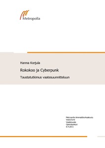 (Metropolia Ammattikorkeakoulu, 2011)Tämän opinnäytetyön tavoite oli kerätä materiaalia rokokoosta ja cyberpunkista mahdollista myöhempää käyttöä varten pukusuunnittelussa. Haluttiin syventää tietoja rokokoosta ja selvittää mitä cyberpunk on. Onko se tyylisuunta ... -