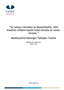 Nässi, Tiia; Mildebrath, Marleena (Laurea-ammattikorkeakoulu, 2015)Tämän toiminnallisen opinnäytetyön aiheena on nuorten osallisuuden vahvistaminen median keinoin. Helsingin Tyttöjen Talolle perustettiin 13-16 –vuotiaille nuorille mediaryhmä keväällä 2015. Opinnäytetyön tavoitteet olivat ...
