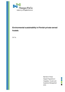 Ta, Chi (Haaga-Helia ammattikorkeakoulu, 2018)This bachelor thesis aims to discover the hostels in Finland are oriented toward achieving environmental responsibility and viability and how environmental sustainability be in-creased within the private sectors. The ...