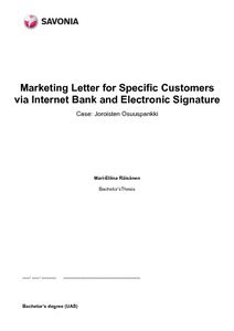 (Savonia-ammattikorkeakoulu, 2013)The final thesis report was done for Joroisten Osuuspankki about sending a marketing letter via the internet bank. The final thesis also consists of a research of the usage of electronic signature in Joroisten Osuuspankki. ... -