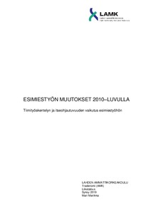 (2019)Opinnäytetyön tarkoituksena oli tutkia esimiestyön muutoksia 2010–luvulla eri alojen näkökulmista. Opinnäytetyössä keskityttiin erityisesti tiimityöskentelyn ja itseohjautuvuuden vaikutukseen esimiestyöhön. Valmis opinnäytetyö ... -