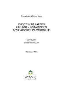 Tämän opinnäytetyön tarkoituksena oli lisätä lapsen liikuntaa Myllykosken päiväkodissa. Tavoitteena oli saada enemmän käyttötarkoituksia päiväkodissa jo olemassa oleville liikuntavälineille ja -tiloille. Myllykosken päiväkoti on ympärivuorokautista var-haiskasvatusta tarjoava päiväkoti, jossa on viisi lapsiryhmää ja paikkoja yhteensä yli sadalle lapselle. Päiväkodin toimintaympäristöön kuuluvat liikuntasali, vesileikkiallas, ryhmätilat sekä laaja ja monipuolinen ulkoilualue.