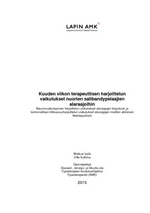 Tässä opinnäytetyössä tarkastellaan kuuden viikon terapeuttisen harjoittelujakson vaikutuksia seitsemän B-juniori-ikäisen salibandypelaajan alaraajojen linjauksiin ja nivelten liikelaajuuksiin. Tutkimusjoukkoon kuului 22 salibandypelaajaa, jotka suorittivat alkumittaukset lokakuussa 2014. Tämän jälkeen pelaajat osallistuivat vapaaehtoisesti kuuden viikon terapeuttiselle harjoittelujaksolle. Joulukuussa 2014 pelaajat suorittivat samat testit kuin lokakuussa ja heistä lopulliseen otantaan valikoitui seitsemän pelaajaa. Mittaukset videoitiin ja niistä saadut tulokset analysoimme Microsoft Excel –taulukointiohjelmalla, jossa hyödynsimme taulukointi- ja laskennallisia ominaisuuksia. Kinovea-videoanalysointiohjelmaa hyödynsimme mittareiden videoanalysoinnissa.