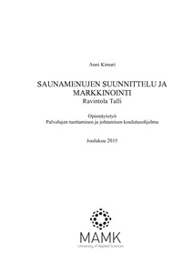 Raportti on jaettu teoria- ja käytäntöosuuteen. Teoriaan kuuluvat tuotekehitys, saunamenujen laatiminen, hinnoittelu ja markkinointisuunnitelman laatiminen. Työn toteutuksesta kertovassa osuudessa käsitel-lään saunamenujen suunnittelua, tuotteiden valintaa, toteutuksen työvaiheita, hinnoittelua ja markki-nointia eli mainosten suunnittelua. Mainosten toteutuksesta kerrotaan markkinointisuunnitelmassa.