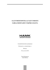 Tämän opinnäytetyön tarkoituksena oli selvittää sairaanhoitajien näkemyksiä ja kokemuksia saattohoitopotilaan kivunhoidosta. Opinnäytetyön tavoitteena oli saada kivunhoidosta kokemusperäistä tietoa, jonka avulla kehittää kokonaisvaltaista kivunhoitoa osastolla, joka toimii opinnäytetyön toimeksiantajana. Opinnäytetyön toimeksiantaja oli kantahämäläisen sairaalan osasto, jossa hoidetaan aktiivisesti saattohoitopotilaita. Tämä opinnäytetyö toteutettiin kvalitatiivisena tutkimuksena, jossa teemahaastattelun avulla kerättiin sairaanhoitajilta tietoa saattohoitopotilaiden kivunhoidosta. Aineisto analysoitiin käyttäen induktiivista sisällönanalyysia.