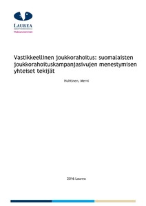Joukkorahoituksella rahoitetaan pienillä tai suurilla summilla yksityishenkilöiden, yritysten tai yhteisöjen kampanjoita. Tämän opinnäytetyön tavoitteena ja tarkoituksena oli tutkia onnistuneita ja hyvin menestyneitä suomalaisia vastikkeellisia eli ennakko-ostoihin perustuvia joukkorahoituskampanjasivuja. Opinnäytetyössä tutkittiin, mitkä asiat vaikuttavat vastikkeellisten joukkorahoituskampanjasivujen menestymiseen ja mitkä asiat tekevät joukkorahoituskampanjasivusta kiinnostavan. Opinnäytetyön menetelmänä käytettiin tutkielmatyyppistä ja laadullista eli kvalitatiivista analyysitutkimusta.