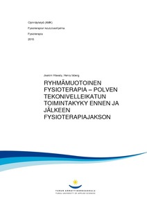 Opinnäytetyön tarkoituksena oli kuvailla polven tekonivelleikkauksen jälkeistä toimintakykyä ennen ja jälkeen ryhmämuotoisen fysioterapiajakson. Opinnäytetyö toteutettiin empiirisenä tutkimuksena ennen ja jälkeen testaus-asetelmalla, jossa haluttiin selvittää potilaan toimintakykyä ennen ja jälkeen ryhmämuotoisen fysioterapiajakson. Opinnäytetyön toimeksiantajana oli Turun terveystoimi. Tutkimukseen osallistui 15 henkilöä, joiden polven tekonivelleikkauksesta oli kulunut 4-6 viikkoa. Ryhmämuotoiseen fysioterapiajaksoon kuului tutkittaville 10 harjoittelukertaa. Fysioterapiajakso koostui neljästä ryhmämuotoisesta fyysisesta harjoittelukerrasta sekä kuudesta ryhmämuotoisesta kuntosaliharjoittelusta, jotka toteutettiin Turun pääterveysaseman fysioterapeutin toimesta. Fysioterapiajakso kesti tutkittavilla 5-6 viikkoa.