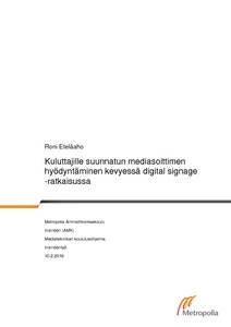 Insinöörityön tarkoituksena oli selvittää ja testata, onko pientä ja edullista mediasoitinta hyödyntäen mahdollista toteuttaa toimiva Digital Signage –järjestelmä eli informaationäyttöjärjestelmä oppilaitosympäristöön. Toteutettavan järjestelmän oli tarkoitus olla kustannustehokas ja helppokäyttöinen. Mediasoitin on suunniteltu yksinomaan viihdekäyttöön, joten sen käyttäminen digital signage -järjestelmän komponenttina on harvinaista. Työssä paneuduttiin erilaisiin digital signage -järjestelmän toteutusmahdollisuuksiin, kuten palvelinpohjaisiin, pilvipalveluihin perustuviin ja yhden tietokoneen avulla toteutettuihin ratkaisuihin. Näiden ratkaisujen teknisiä toteutuksia vertailtiin keskenään ja tuotiin esille sisällöntuotannon mahdollisuuksia erityisesti käytännön esimerkin avulla. Lisäksi työssä käytiin seikkaperäisesti läpi digital signagen rooli liiketoiminnassa ja sen erilaiset käyttötarkoitukset. Käyttötarkoitukset jakautuvat tuotteiden tai palveluiden markkinoimiseen näiden välittömässä läheisyydessä, digital signagen hyödyntämiseen tilanteissa, joissa kuluttajilla on joutoaikaa ja sen kohdistamista liikkeessä oleville kuluttajille.