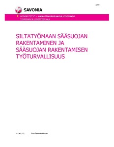 Opinnäytetyön aiheena oli siltatyömaan sääsuojan rakentaminen ja työturvallisuus. Työssä oli tarkoituksena tehdä Skanska Infra Oy:lle selkeä tietokokonaisuus sääsuojan rakentamisesta ja sen eri rakentamistavoista ja työturvallisuudesta. Ohjeeseen otettiin huomioon työturvallisuus, sääsuojan mitoitus, putoamissuojaus, käyttöönottotarkastus, rakentamistavan valinta, rakentamistapojen vertailu, turvallisuussuunnitelma, riskit, kustannukset ja lisäksi kartoitettiin ajatuksia rakentamistapojen parantamisesta.
