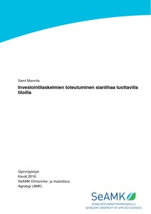 Opinnäytetyön tarkoituksena oli selvittää miten investointien kustannusten ja tulojen arvioinnit ovat onnistuneet. Opinnäytetyössä selvitettiin myös, miten nykyisiä investointilaskelmia voidaan kehittää. Tutkimus toteutettiin haastattelututkimuksena. Tutkimukseen haastateltiin kymmentä vuosien 2009–2013 välillä lihasikatuotantorakennukseen investoinutta maatalousyrittäjää ja viittä investointilaskelman laatijaa Länsi-Suomen alueelta.