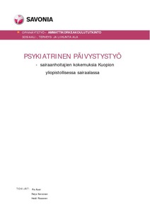 Tämän opinnäytetyön tarkoituksena oli kuvata sairaanhoitajien kokemuksia psykiatrisesta päivystystyöstä Kuopion yliopistollisessa sairaalassa. Tavoitteena oli saada tietoa psykiatrisen päivystyksen toiminnasta, toimivuudesta, työn haasteista sekä hyödyllisyydestä. Lisäksi haluttiin selvittää mahdollisia kehittämistarpeita, jotta toimintaa on