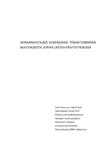Laine, Noora & Liukko, Paula. Sairaanhoitajien kokemuksia triagetoiminnan muutoksesta Jorvin lasten päivystyksessä. Diak Helsinki, kevät 2016. 52 sivua, 3 liitettä. Diakonia-ammattikorkeakoulu. Hoitotyön koulutusohjelma, diakonisen hoitotyön suuntautumisvaihtoehto, sairaanhoitaja (AMK) + diakonissan virka-kelpoisuus.