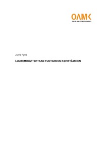 Tämän opinnäytetyön aiheena oli Oulun Ylikiimingissä sijaitsevan Ykimuovi Finland Oy:n tuotannon kehittäminen. Ykimuovi on Victorius-konserniin kuuluva lujitemuovialan yritys. Työn ensimmäisenä tavoitteena oli vertailla alipaineinjektiota ja ruiskulaminointia valmistusmenetelminä ja tutkia, onko Ykimuovin järkevää siirtyä käyttämään alipaineinjektiota jo käytössä olevan ruiskulaminoinnin sijaan. Tämän vertailun pohjalta toisena tavoitteena oli tehdä nykytilan kuvaus ja dokumentaatio Ykimuovin tuotannosta. Nykytilan kuvauksen pohjalta tarkoituksena oli löytää kehityskohteita tuotannosta, minkä jälkeen kehityskohteet ja -ideat käytiin läpi yrityksen johtohenkilöstön kanssa. Kohteet asetettiin tärkeysjärjestykseen ja niistä kolme tärkeintä ja ajankohtaisinta toteutettiin.