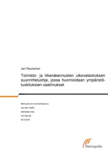 Opinnäytetyö on tehty tutkielmana. Aineistona on käytetty eurooppalaista standardia EN-SFS12464-2 Light and lighting. Lighting of work places. Part 2 Outdoor work places sekä kansallisia valaistussuosituksia ja suunnitteluohjeita. Ympäristöluokituksia käsittelevissä luvuissa aineistona on käytetty LEED- ja BREEAM-ympäristöluokituksien vaatimuksia ja arviointiohjeita sekä vaatimusten pohjalla olevia valaistusstandardeja.