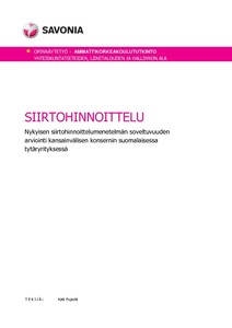 Tämän opinnäytetyön tarkoituksena oli arvioida kansainväliseen konserniin kuuluvan suomalaisen tytäryrityksen käyttämän siirtohinnoittelumenetelmän soveltuvuutta. Yrityksen kokoluokitus muuttui pienestä ja keskisuuresta yrityksestä osaksi suurta konsernia omistajanvaihdoksen myötä, josta johtuen siirtohinnoitteludokumentaation vaatimus astui voimaan. Tässä yhteydessä oli luonnollista arvioida pitkään käytössä ollutta menetelmää ja sen soveltumista nykyiseen liiketoimintamalliin.