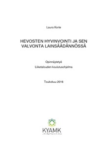 Opinnäytetyön aiheena on hevosten hyvinvointi ja sen valvonta lainsäädännössä. Opinnäytetyön tavoitteena on tutkia, mitä ovat hevosten hyvinvoinnin edellyttämät vähimmäisvaatimukset lainsäädännössä, miten eläinsuojeluvalvonta toteutuu käytännössä ja minkälaisia rikkeitä voi tapahtua. Työssä on käyty läpi hevosten hyvinvointiin liittyvä keskeinen lainsäädäntö, hyvinvointiin vaikuttavia tekijöitä, eläinsuojeluviranomaisten toimintaa sekä hyvinvoinnin laiminlyömisestä johtuvia seuraamuksia.