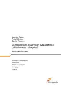 Opinnäytetyön tarkoituksena oli kuvata mitä kansainvälinen tutkimustieto kertoo siitä, mitä osaamista sairaanhoitajalta edellytetään syöpäpotilaan palliatiivisessa hoitotyössä. Tavoitteena oli tuottaa tietoa, jonka avulla sairaanhoitajien osaamista syöpäpotilaan palliatiivi-sessa hoitotyössä voidaan kehittää esimerkiksi lisäämällä sairaanhoitajien tietämystä syöpäpotilaan palliatiivisen hoitotyön osaamisesta ja kehittää sairaanhoitajan perus- sekä täydennyskoulutusta. Tavoitteena on myös osoittaa aihealueeseen liittyvä lisätutkimuksen tarve.