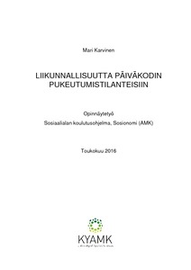 Työ oli toiminnallinen opinnäytetyö ja samaan aikaan kehittämistyö. Työn tavoitteena oli lisätä pukeutumistilanteen liikunnallisuutta tuottamalla konkreettinen työväline, joka tukee liikunnallisuutta ja lapsilähtöisyyttä pukeutumistilanteessa.