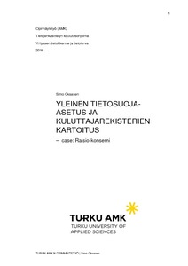 Tämän opinnäytetyön tavoitteena oli luoda tiivistelmä Euroopan unionin yleisen tietosuoja-asetuksen yksityiseen yritykseen liittyvistä artikloista ja selvittää Raisio-konsernin kuluttajarekisterien nykytila. Opinnäytetyön toimeksiantaja oli Raisionkaaren Teollisuuspuisto Oy, joka on osa Raisio-konsernia.